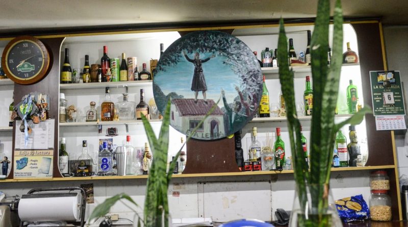 En la barra, frente a la caja registradora, “Eva Levita” de Santoro reemplaza al reloj del local. Iluminado por un halo de luz natural que lo vuelve aún más místico, este óleo redondo recuerda a las pinturas circulares religiosas. Eva Perón alza los brazos para quienes se acercan, como maravillados, a verla elevarse sobre un tejado. Cuenta Santoro que fue inspirada en la icónica escena de Teorema, de Pasolini, donde algo similar le sucede al personaje de la campesina: “Tiene que ver con la necesidad popular de la irrupción del milagro. En la película de Pasolini quedan todos encantados porque la mujer que parecía que no era nadie, tiene esa capacidad de elevarse. Me interesa lo mitológico de alguien que se convierte en una figura excepcional que trasciende las ideologías políticas”, reflexiona el célebre pintor en diálogo con Ñ, sentado en una mesa del bar. “Parece que los tiempos se superan, pero la necesidad del mito está siempre”.