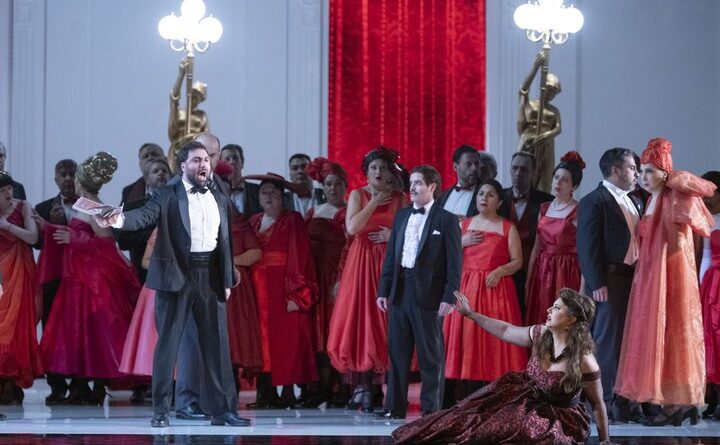 Una mención aparte merece el excepcional vestuario de Renata Schussheim, que transitó entre el blanco y negro del primer acto y la paleta de rojos, naranjas y fucsias de la fiesta en casa de Flora, con inspiración en la moda de los años ‘50 y ‘60 y sus toques extravagantes que aportaron colorido y variedad al conjunto.En "La Traviata" hubo muy buenas voces y cohersión entre los cuerpos estables del Colón. Foto: Prensa Teatro Colón / Lucía Rivero